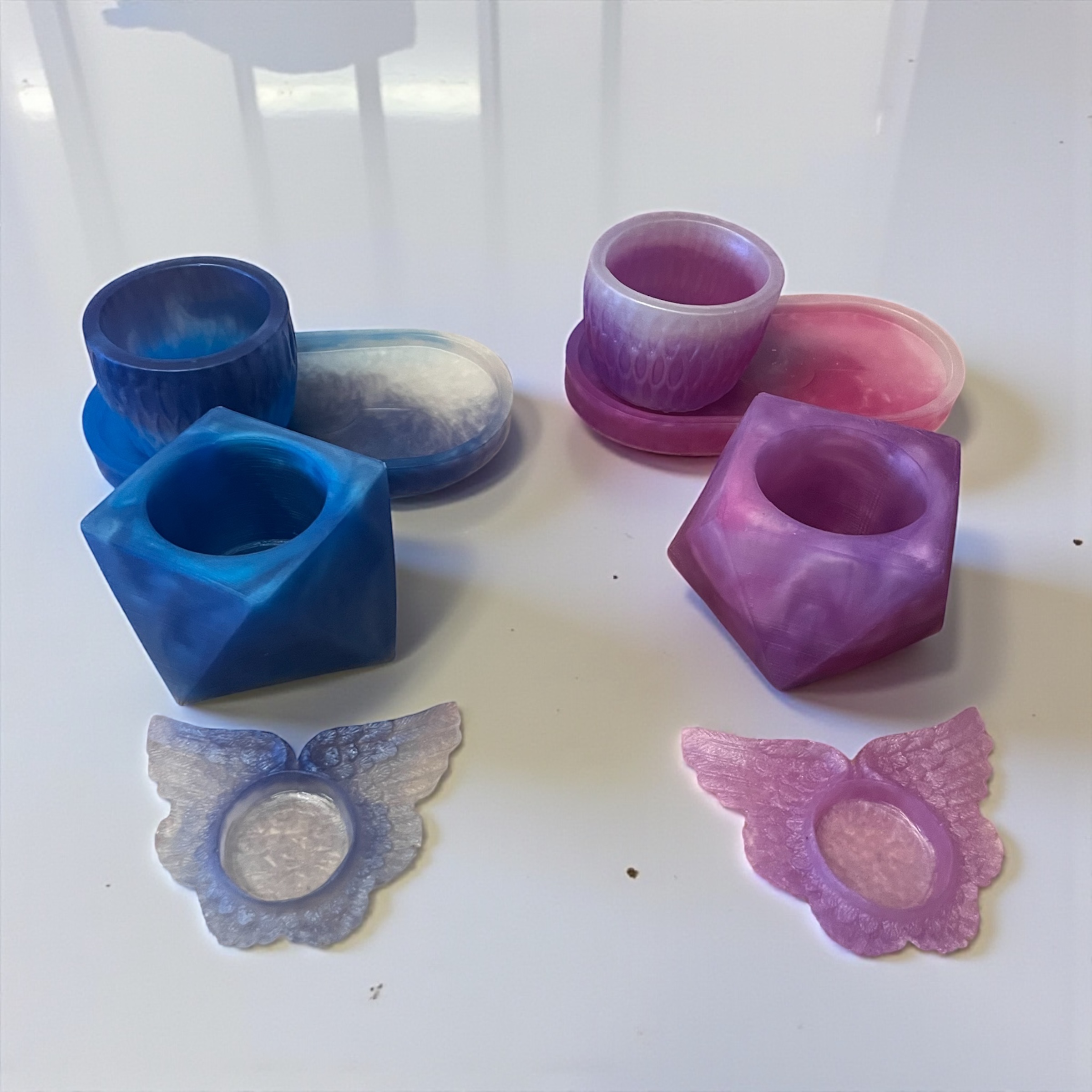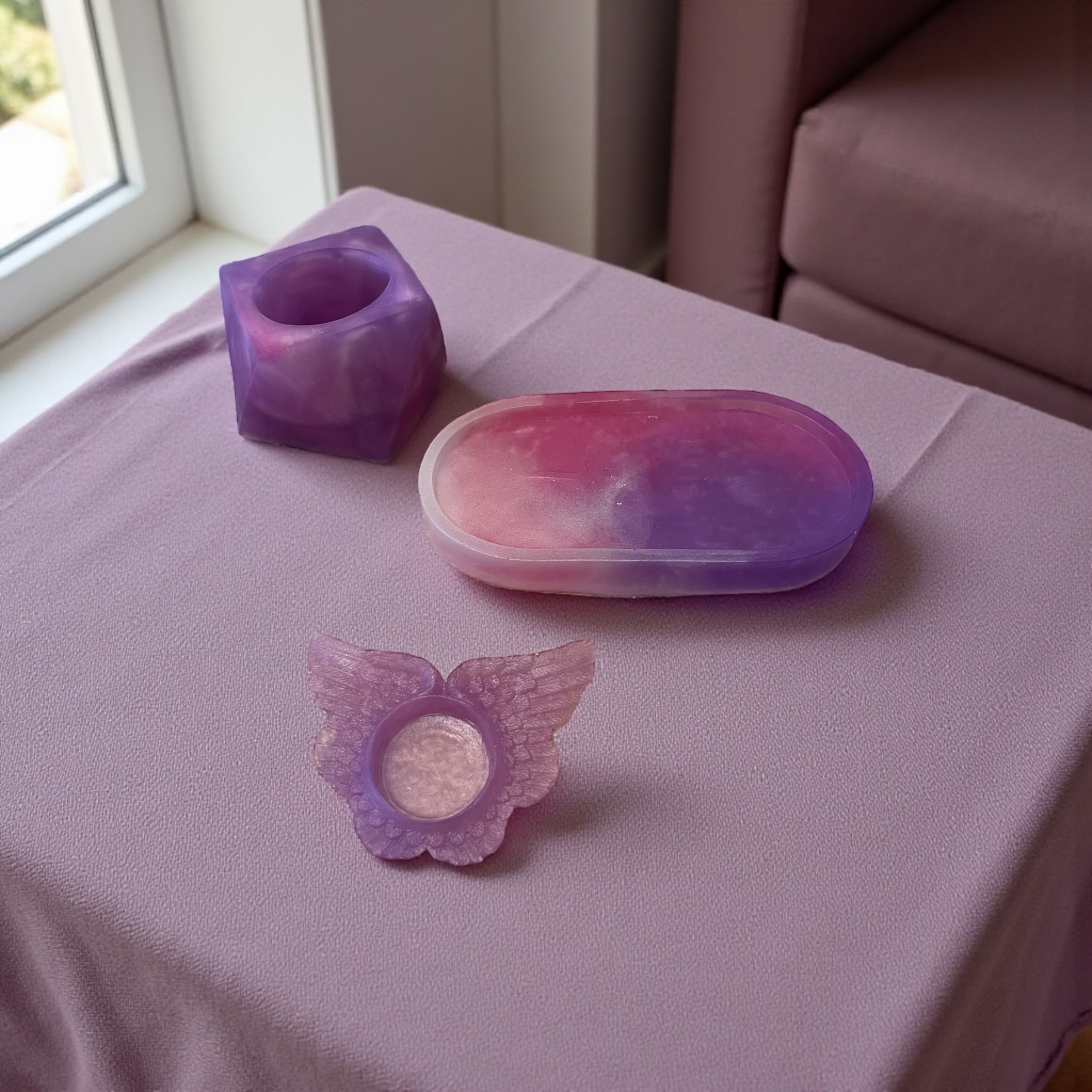 Bu el yapımı epoksi set; tepsi, bardak altlığı, mumluk ve kase seçeneklerinden oluşur. İsterseniz mum dökülmüşversiyonunu tercih ederek, evinizin havasını yumuşak bir ışık ve hoş bir koku ile tamamlayabilirsiniz.