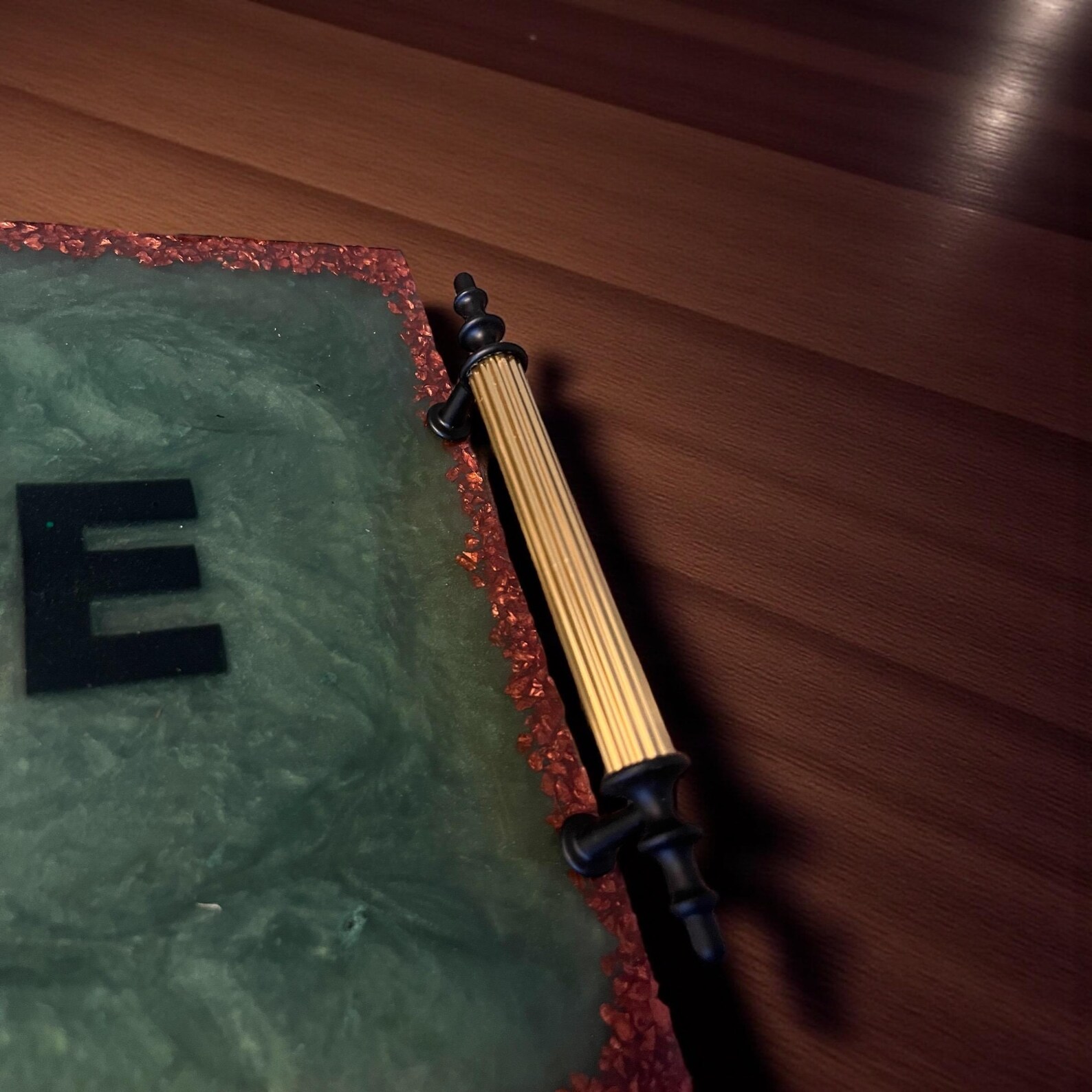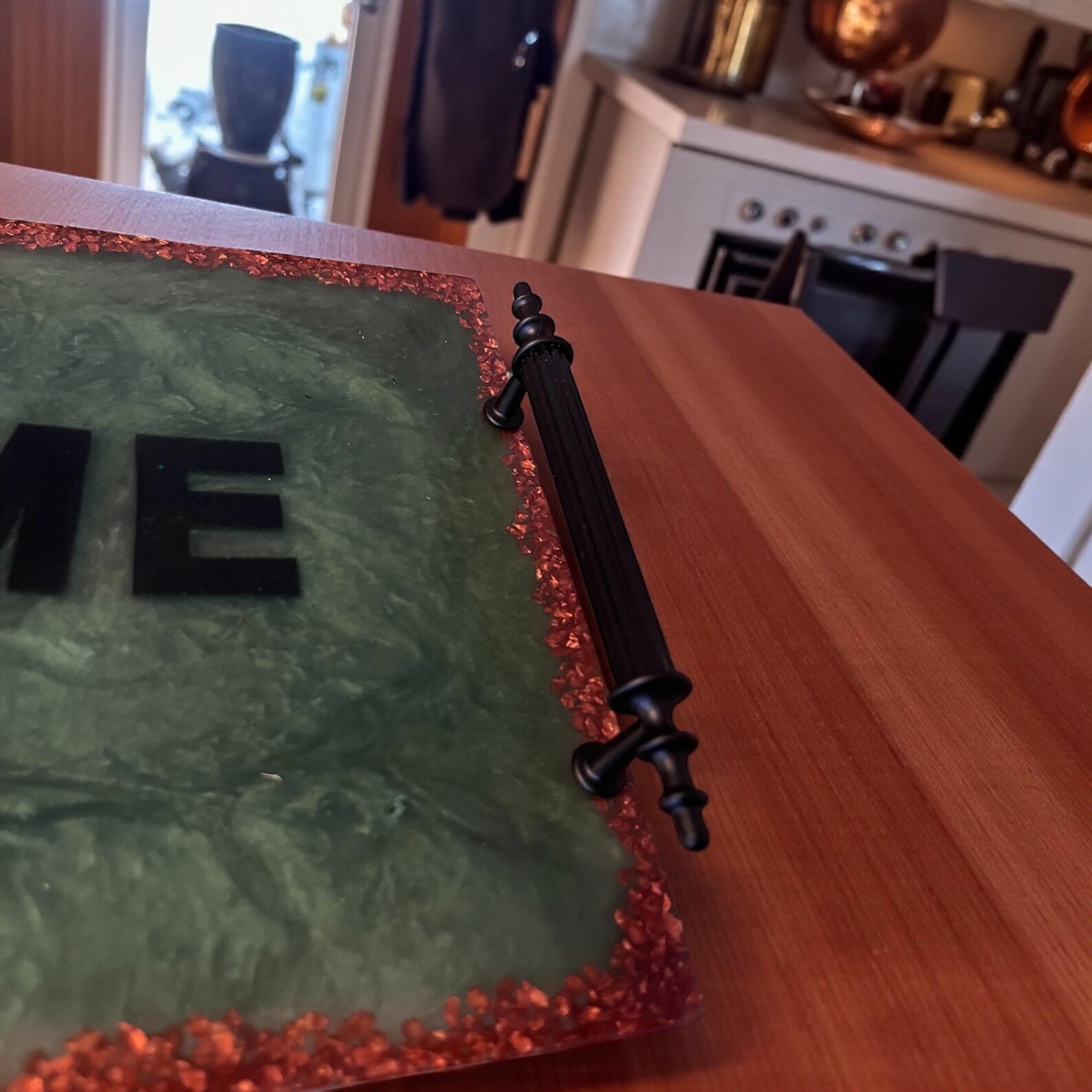 Bu el yapımı yeşil epoksi sunum tepsisi, üzerinde yer alan siyah “HOME” yazısı ve çevresini saran ışıltılı bakır kristal detayları ile hem sanatsal hem de fonksiyonel bir tasarıma sahiptir. Her biri tek tek elde üretilir, bu nedenle hiçbir tepsi diğeriyle birebir aynı değildir — her biri kendine özgü bir ışıltı taşır.